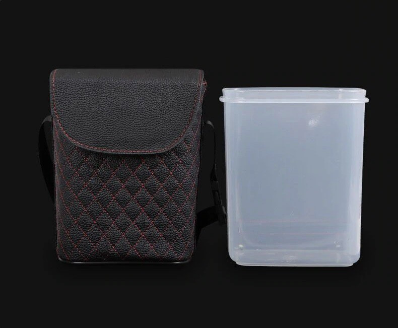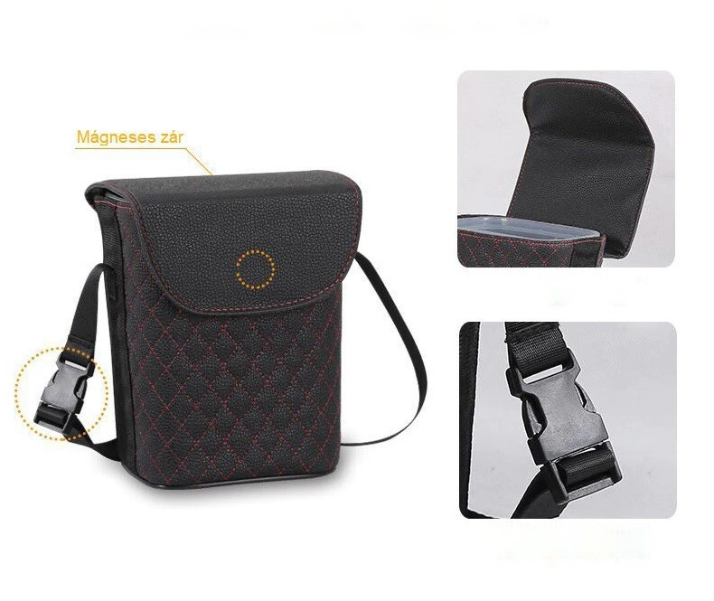 A termék külseje elegáns (a választható négy szín közül pedig egy garantáltan illeni fog autód belsejéhez), minőségi műbőr anyagú, ami a belsejében található műanyag dobozt rendkívül stabilan tartja a helyén. Ennek a műanyag belsőnek hála nem kell a folyadékoktól sem tartanod, sem tárolás eseten (félni, hogy esetleg kiborulna), sem pedig szemétként beleöntve.