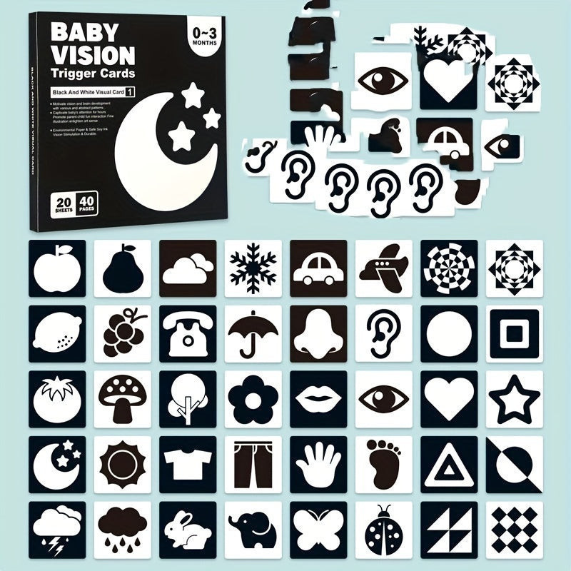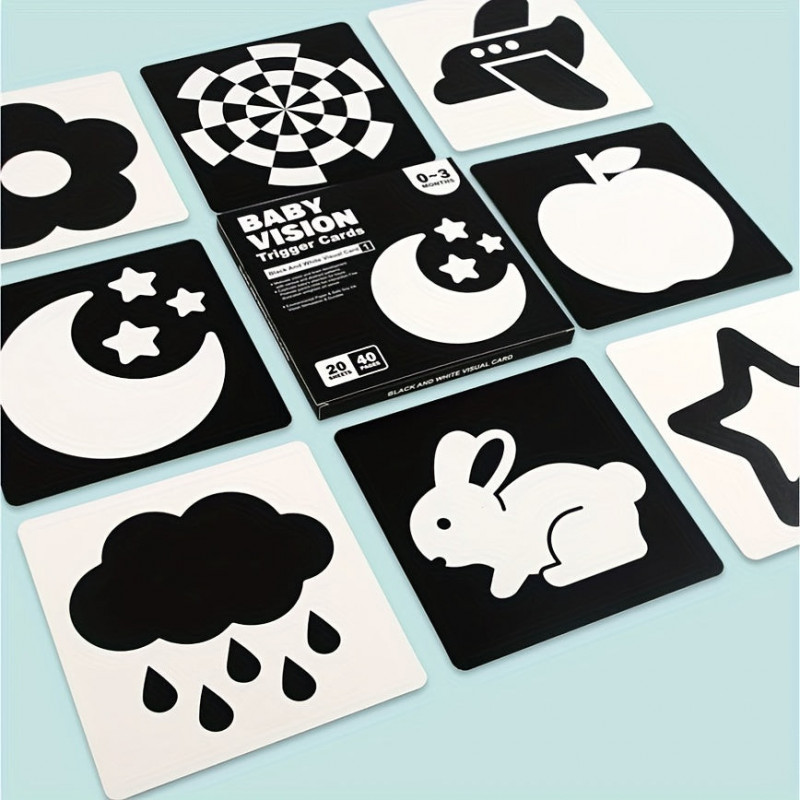 A Fekete-fehér Kontraszt Kártyák 0-3 Hónapos Korig segítségével már az újszülött kortól kezdve fejlesztheted a baba látását és figyelmét. Az egyedi mintákkal és erős kontrasztokkal rendelkező kártyák ideálisak a csecsemők számára, hogy fokozzák a vizuális élményeiket és segítsék őket a látás fejlődésében. Az anyukák és apukák egyaránt imádni fogják ezeket a kártyákat, mert egyszerre szórakoztatóak és tanítóak!